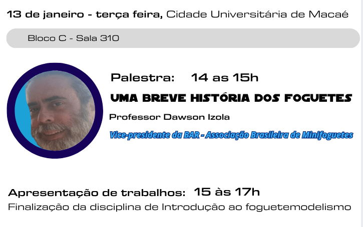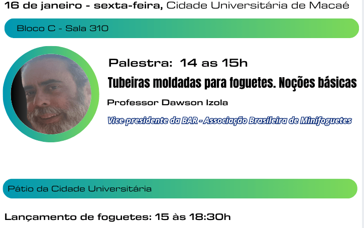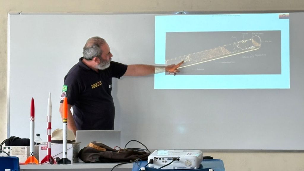 Em 2026 recebemos o prof. Dawson Izola, da Faculdade Hermínio Ometo (FHO) de Araras – SP e vice-presidente da BAR – Associação Brasileira de Mini foguetes, que nos trouxe seus mais de 40 anos de experiência como foguetemodelista. O professor Dawson tem mais de 40 anos de experiência com foguetes, diversos livros publicados e vários TCCs e mestrados orientados na á